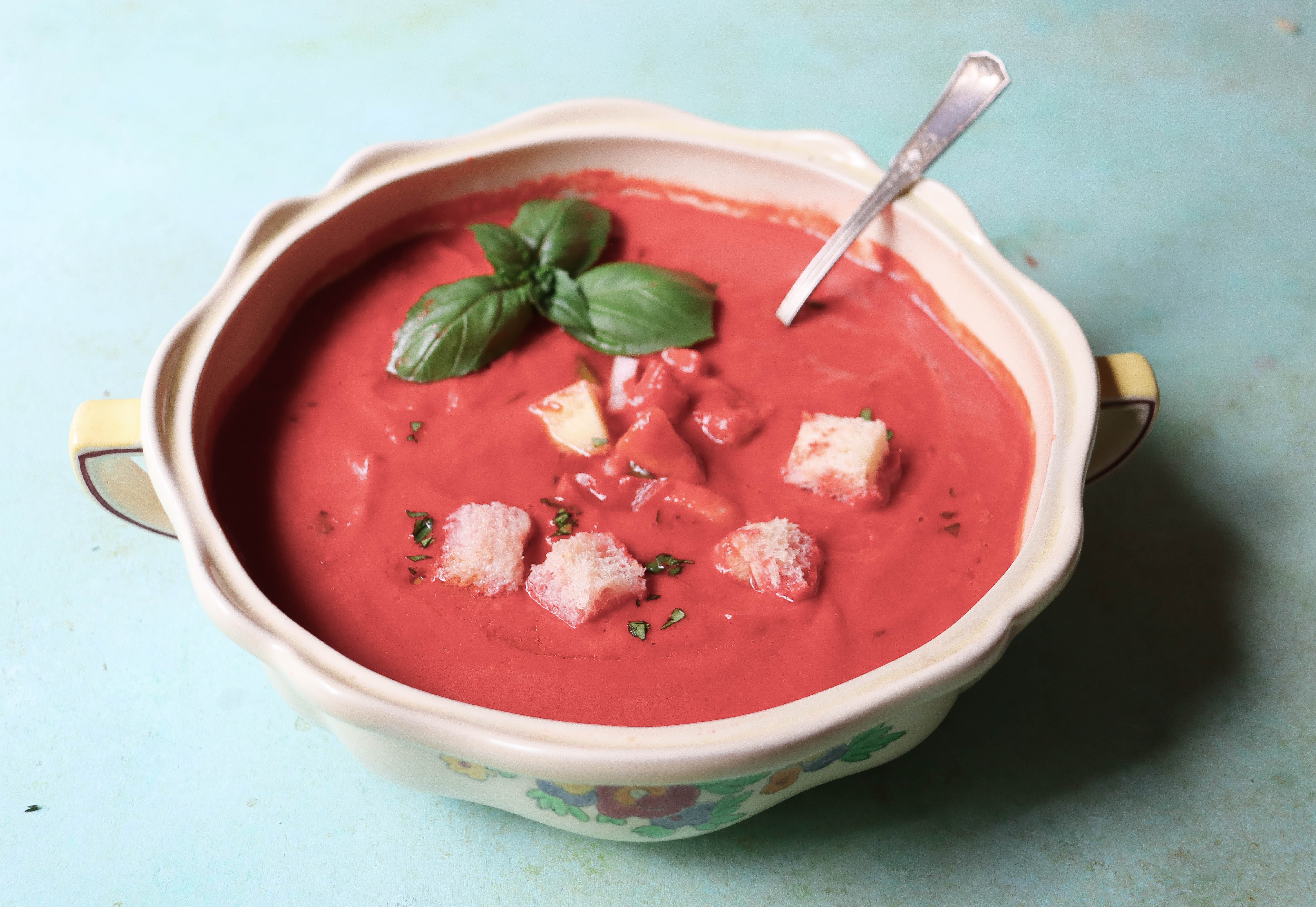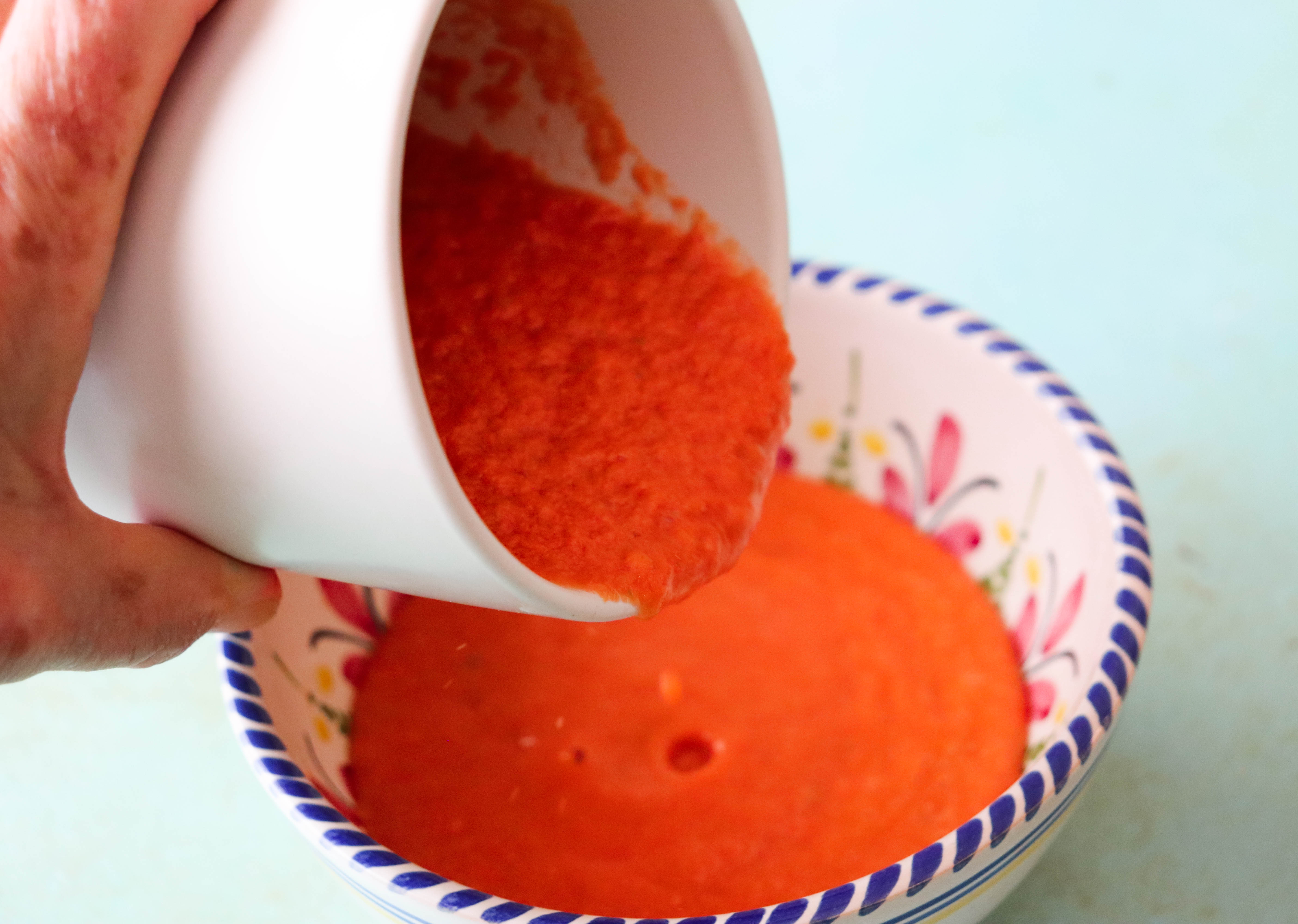 It’s a wonderful soup to cool down with during the hot summer months! Gazpacho is a rustic soup and should therefore be prepared simply. (I remember learning this recipe at the Le Cordon Bleu school in Madrid where the chefs tried to ‘French-ify’ the soup by first peeling the skin from the bell peppers, then making fancy ‘quenelle shapes’ with the garnish vegetables. Needless to say, I’ve left those steps out)!