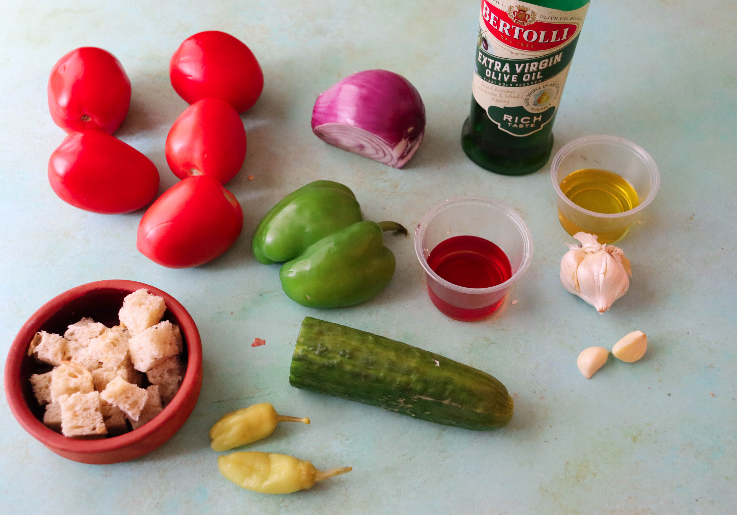Slice the tomatoes in half, remove the core and seeds. Chop roughly into 1/2 inch chunks and set aside. Cut the green bell pepper in half, remove white pith and seeds. Set aside 1/4 of the pepper to be used later for the garnish. Roughly chop the remainder into 1/2 inch chunks. Remove skin from the garlic, cut in half and then dice. Chop the red onion coarsely. Chop the Greek Peperoncini peppers in half, if using. Slice the cucumber in half, peel and remove excess seeds. Set aside 1/4 of the cucumber to be used later for garnish., Chop the remainder into large chunks. Add the tomatoes first to the blender, then add the peppers, garlic, onion, and cucumber. Add the sherry vinegar and salt. Blend on low speed first for 15 seconds, then on high speed until the mixture is pureed. With the motor running, add 1/2 cup Extra Virgin Olive Oil to the blender and run on low until the oil is emulsified. Remove the crust from one piece of bread and cut into medium-sized pieces. Add the bread pieces to the blender and blend until the soup reaches the desired thickness. If necessary, add cold water to the soup to thin it down. Taste and adjust for seasoning and flavor balance. Pour the soup into a bowl and chill in the fridge for at least 30minutes. For garnish, add finely chopped onion, diced green or red bell peppers, croutons, chopped cucumber, or cilantro.Gazpacho