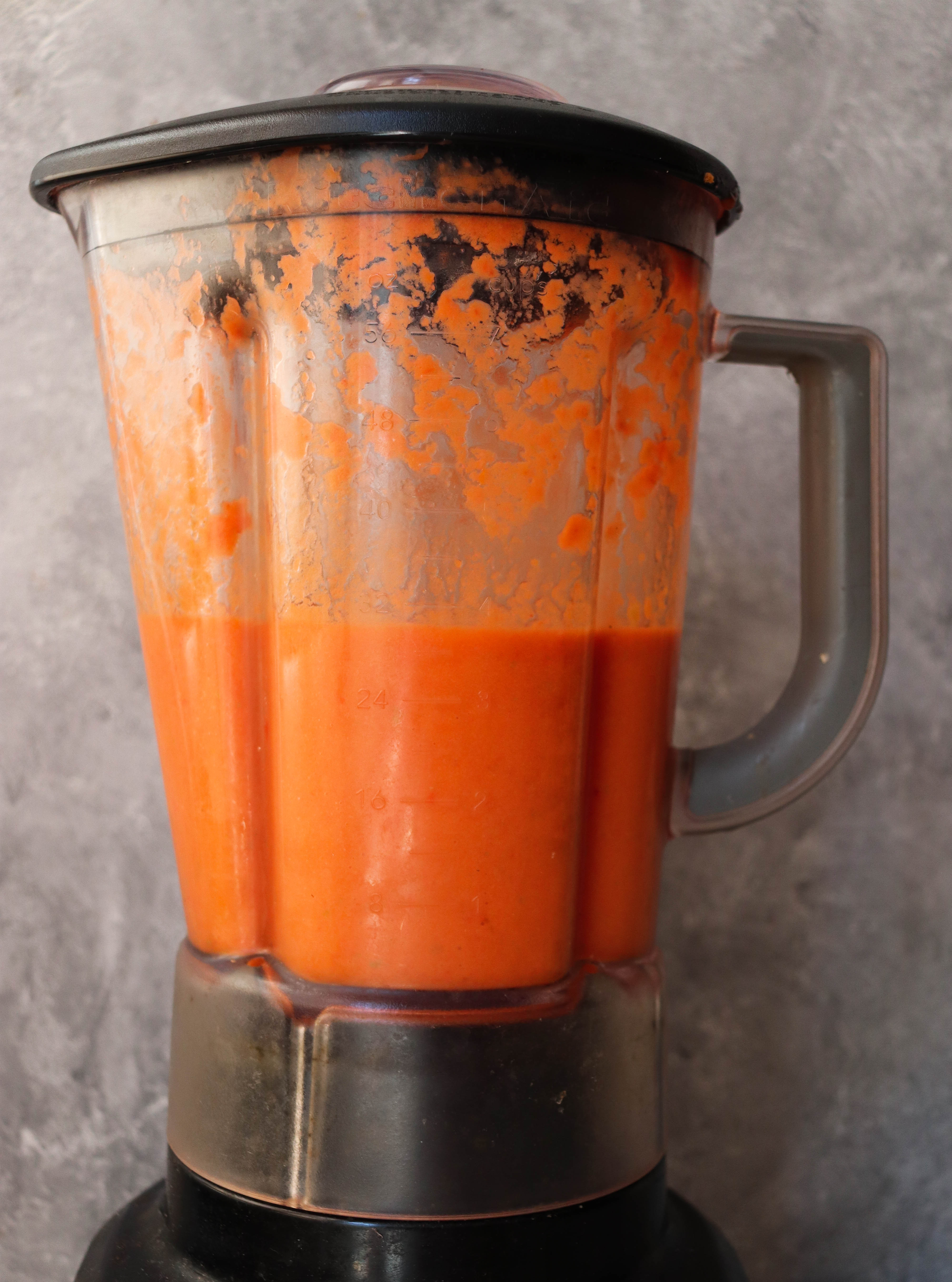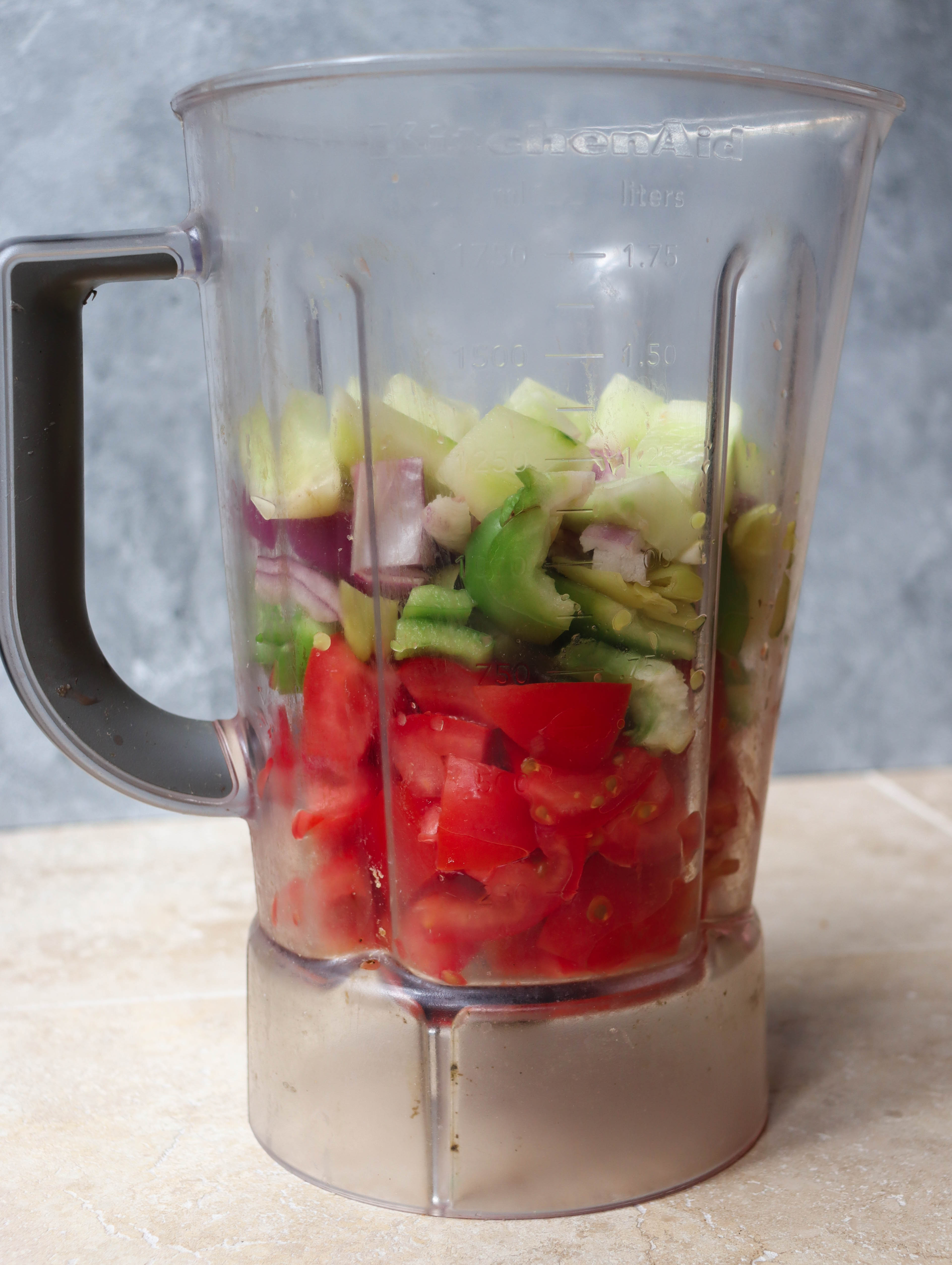 Add all the ingredients to the blender (except the bread crumbs), with the tomatoes and bell peppers on the bottom (this makes it easier to blend). Purée on high, then add the bread crumbs to thicken the mixture.