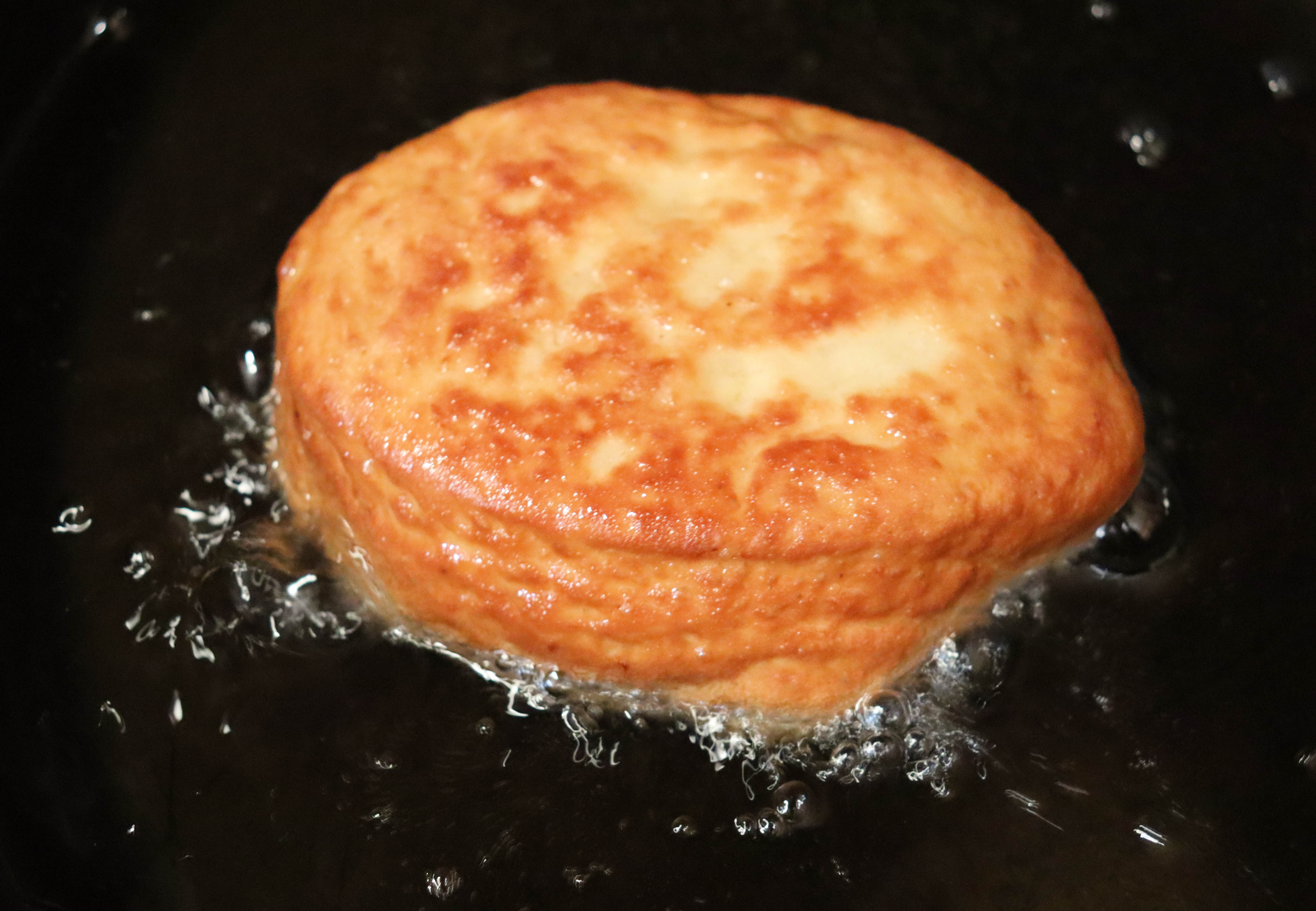 To fry the donuts, fill a large fry pan or pot with 2 1/2 – 3 inches of vegetable oil; lift each parchment square containing a donut and drop face down into medium-hot oil. Fry each side until golden brown; careful not to burn.