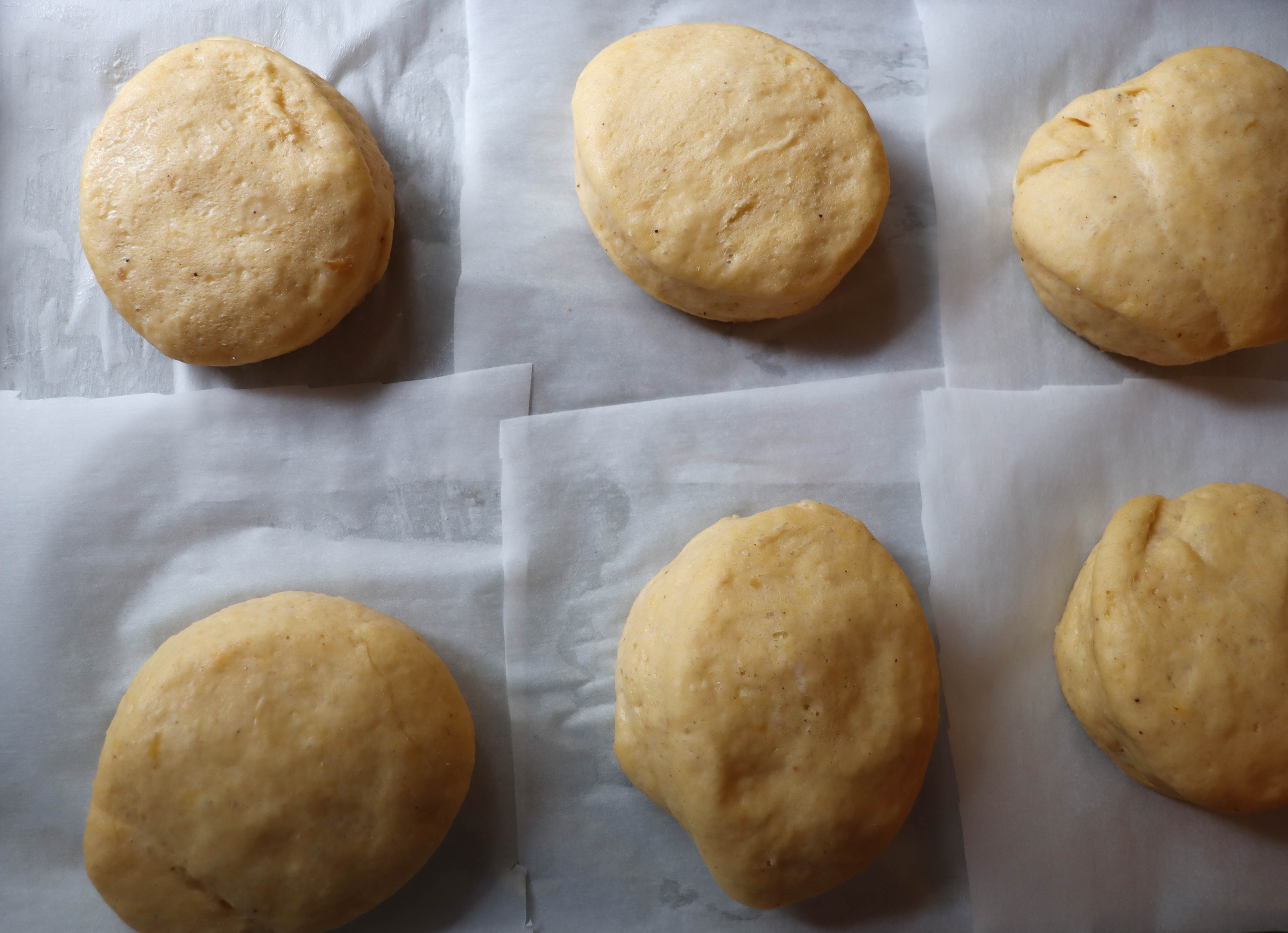 Transfer dough to a bowl and let rise until double in size. Roll out dough to 1/2 inch in thickness; cut out into 3-inch rounds and place each round onto a square of parchment paper; let rise again until double in size.