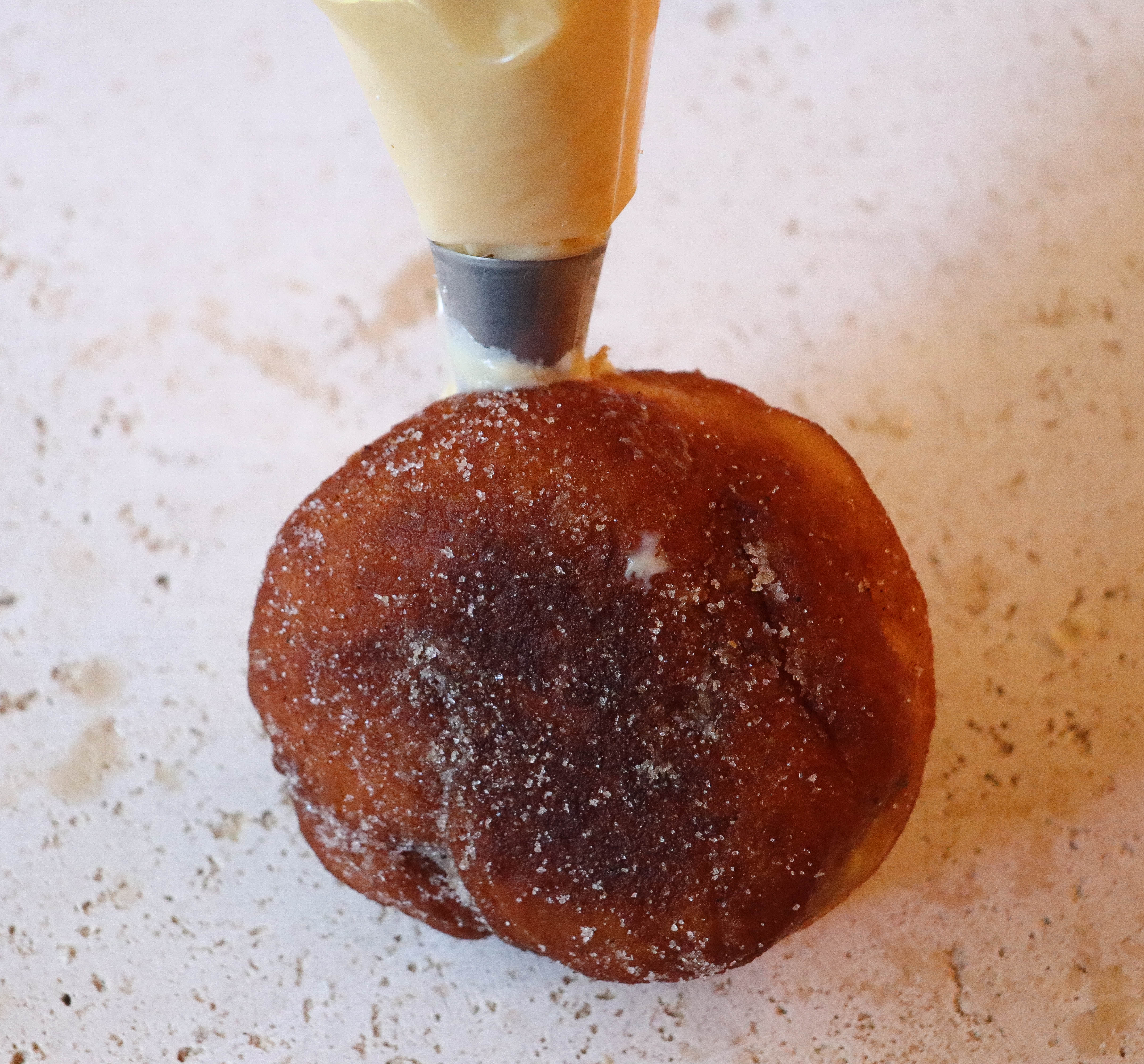 After the filling has chilled, puncture a small hole into the top of each donut and use a chopstick to create a larger pocket to hold the filling. Transfer filling to a pastry bag fitted with a 1/4 inch nozzle and pipe a heaping tablespoon of filling into each donut.