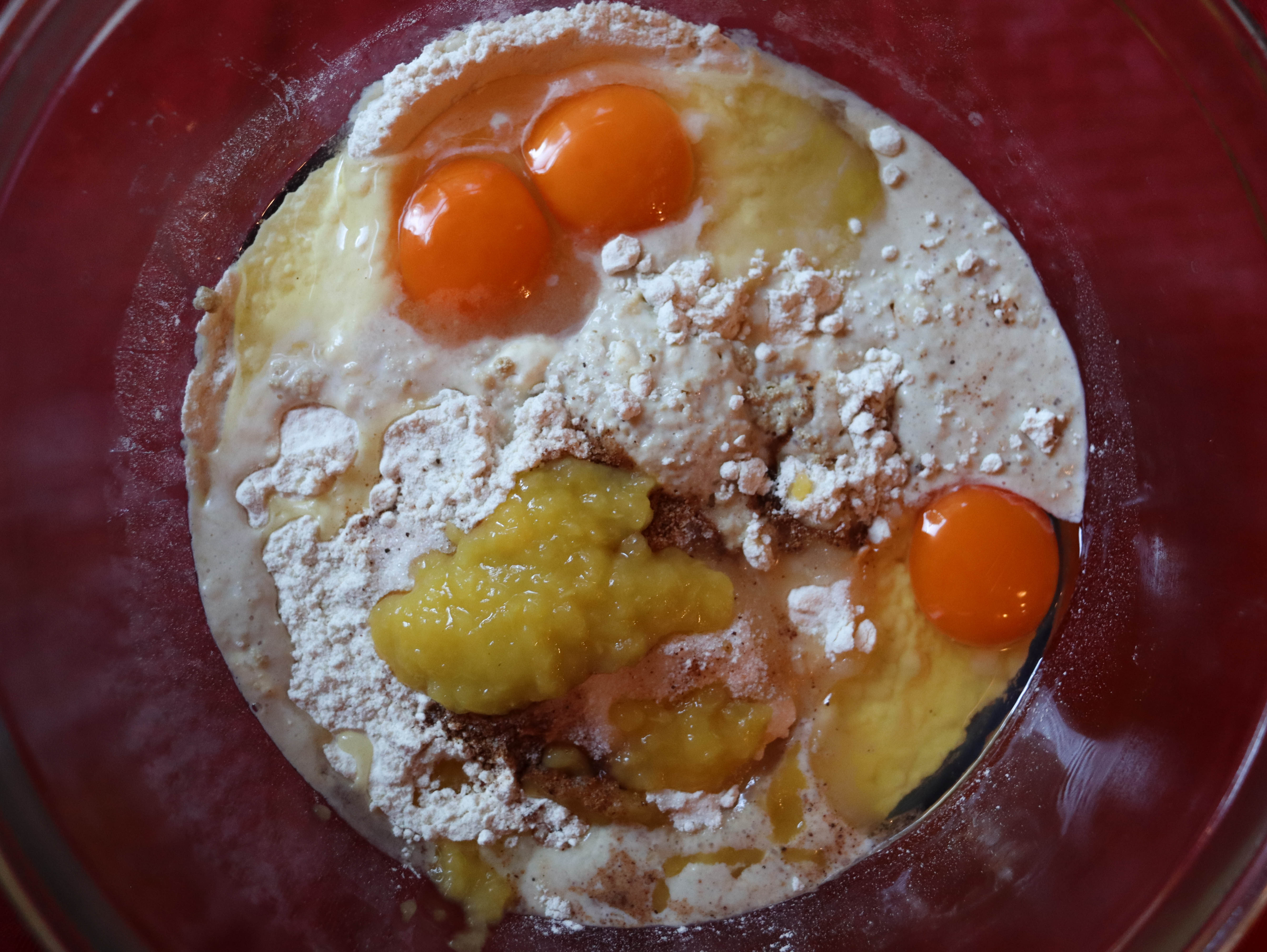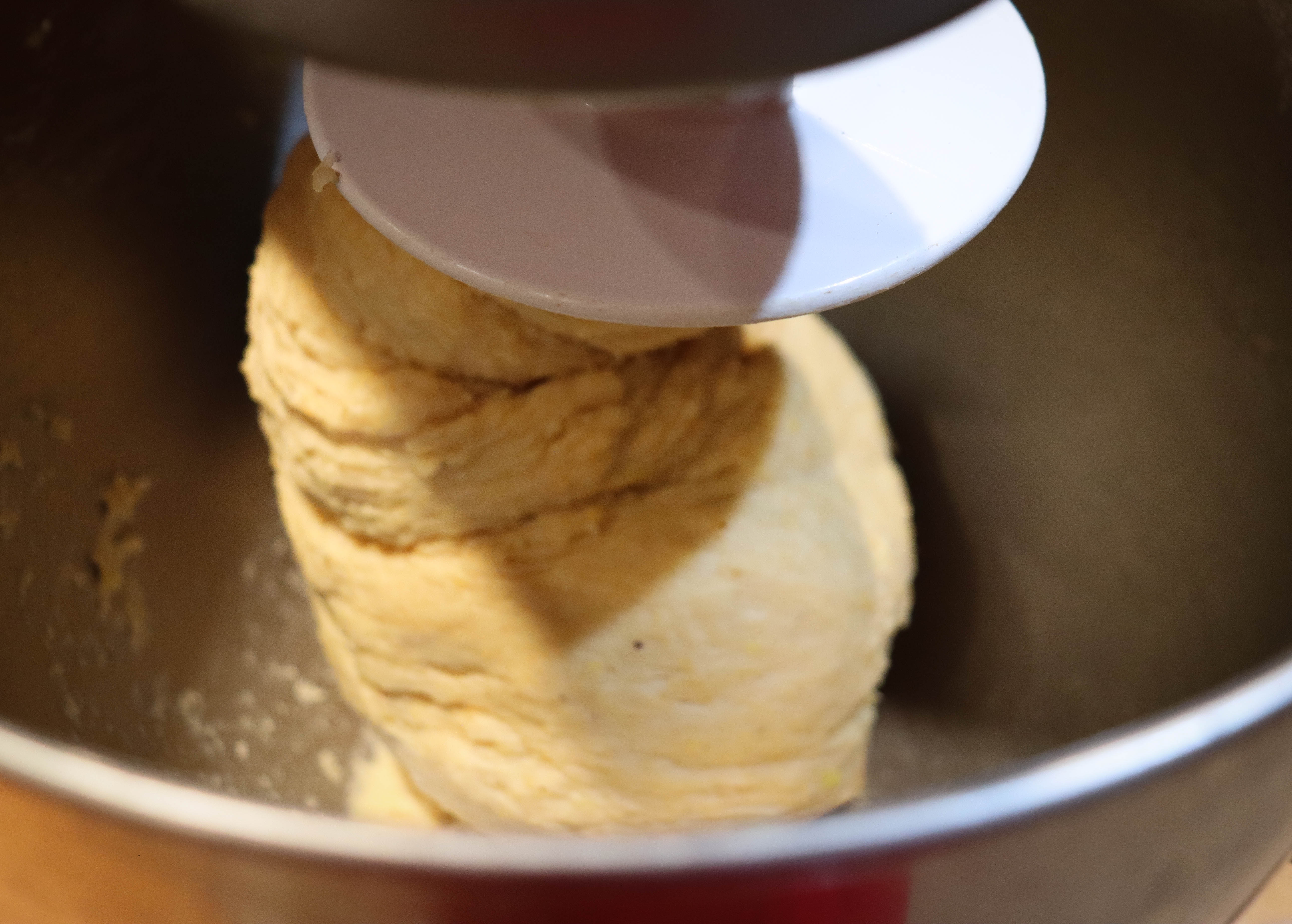Using either a regular electric mixer or one with a dough hook, combine the yeast, eggs, mango puree, cream, sugar, flour, salt, and nutmeg. Once combined, add the butter; knead for another 3-4 minutes. Dough should be moist but not sticky.
