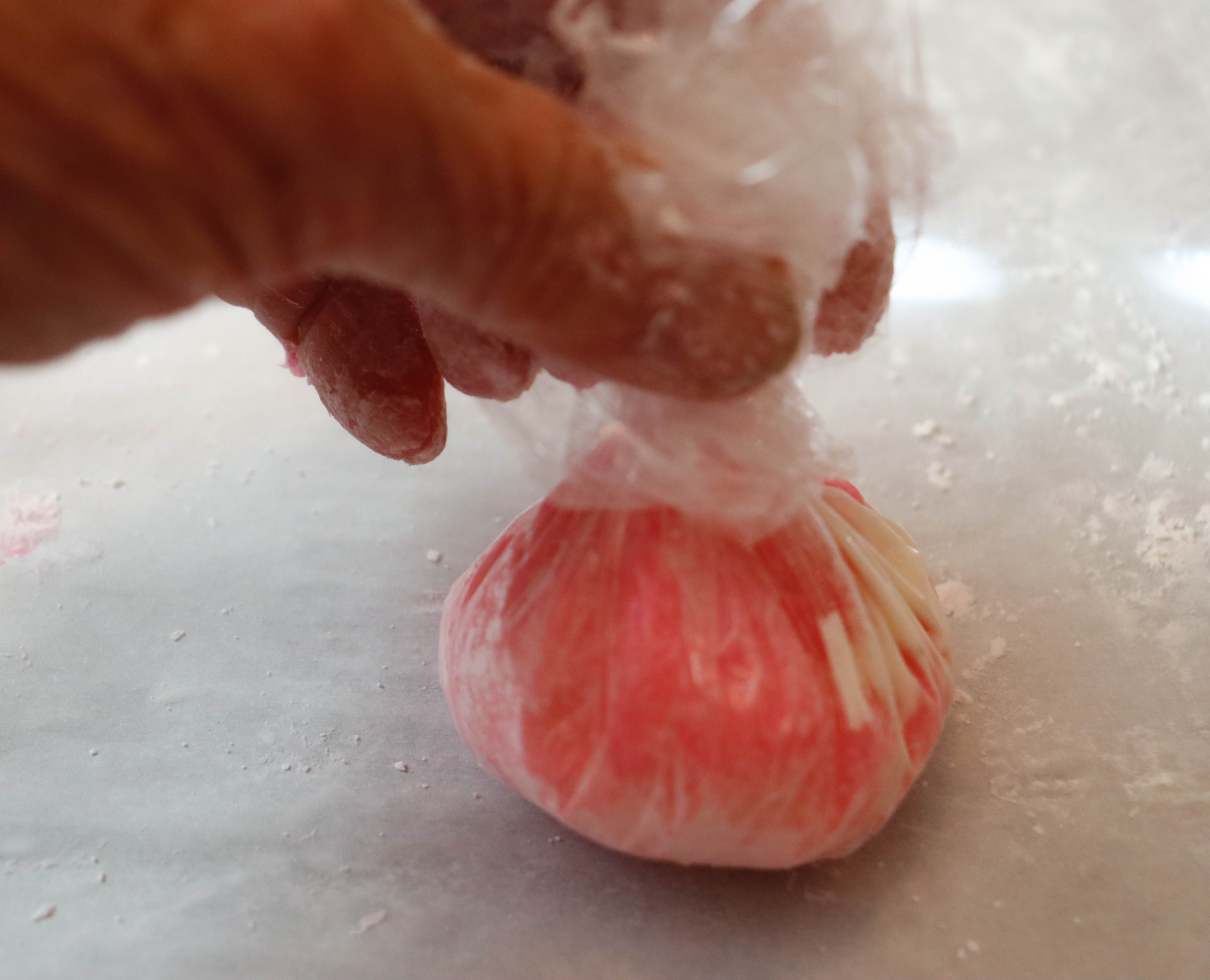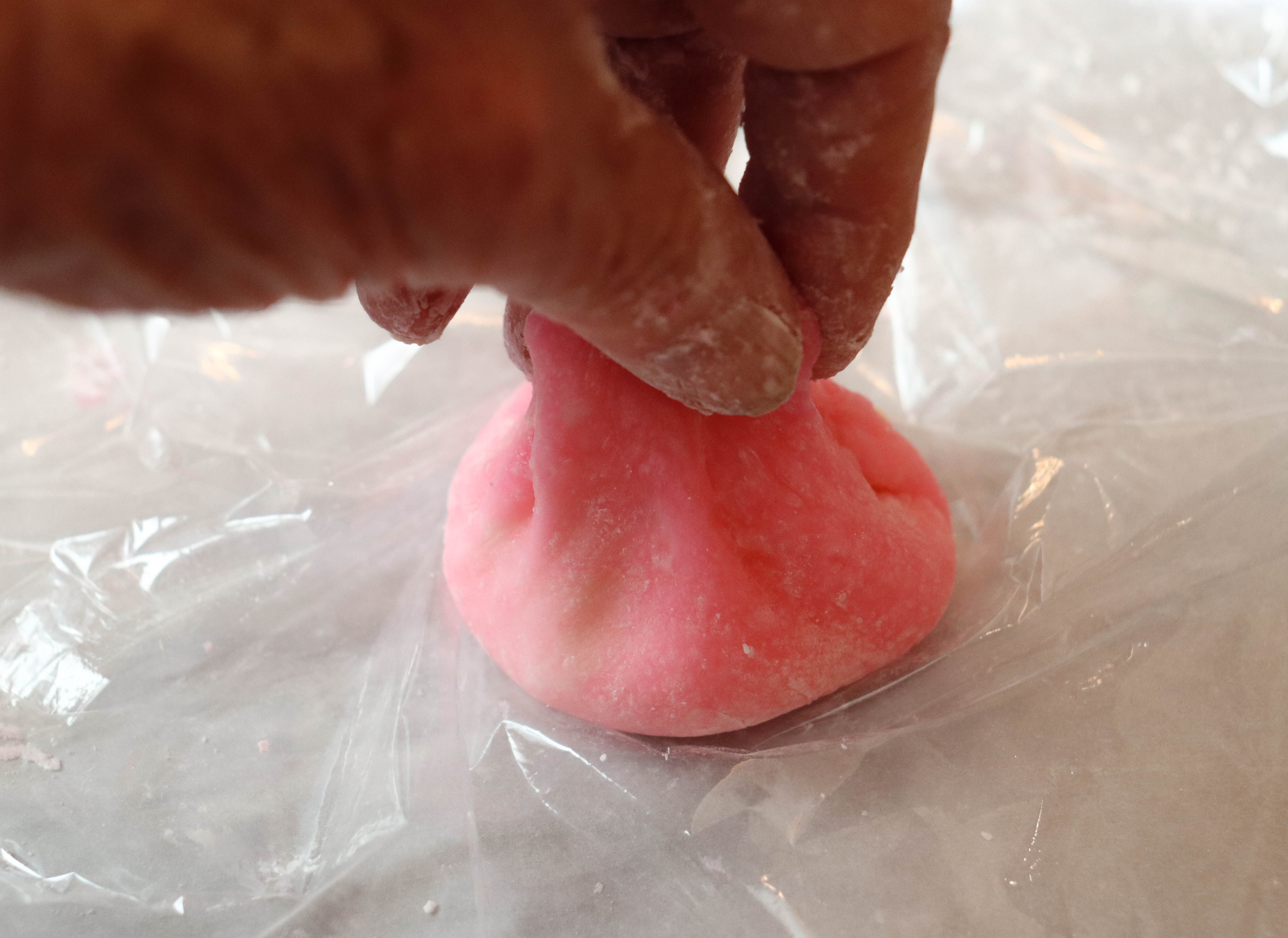 Dust off excess corn starch and place the mochi ball on top of a square piece of plastic wrap measuring about 6×6 inches. Bring the sides of the plastic up to completely surround the mochi ball, then twist the top of the plastic to create some pressure in the ball.
