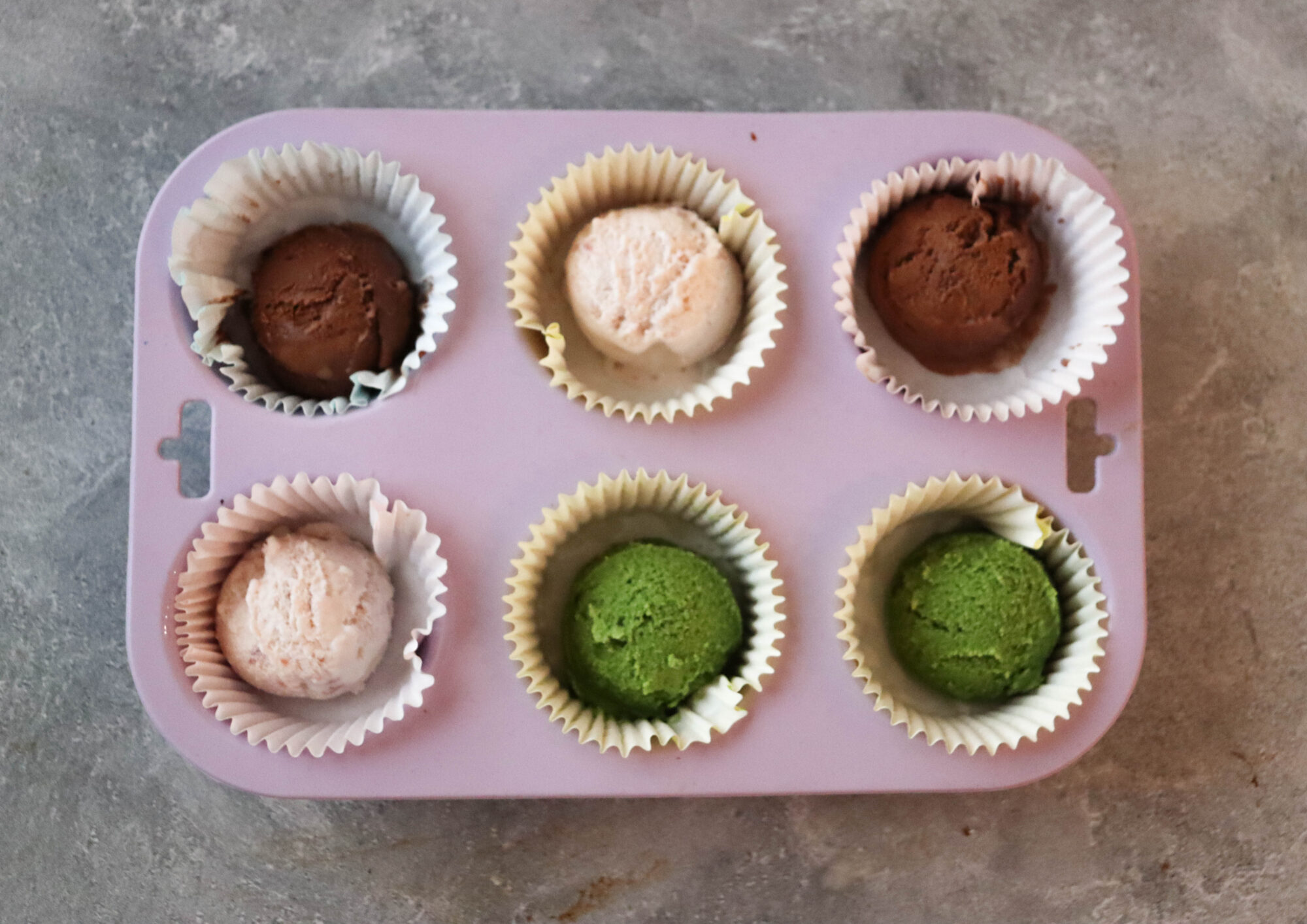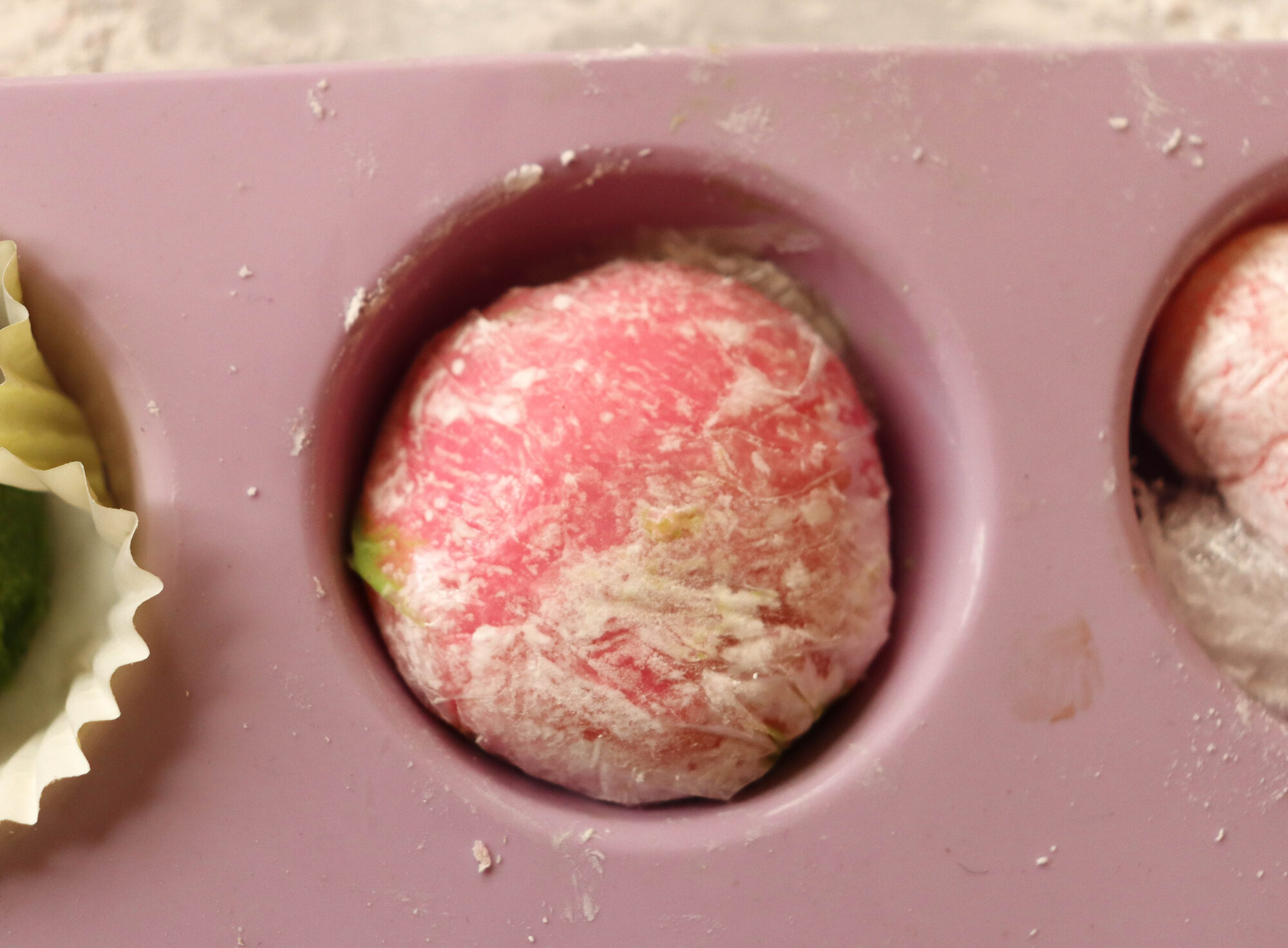 Turn the plastic over to see that your mochi ball has a nice round shape and that there is a bit of pressure shaping the ball. Then place the mochi into a cupcake holder with the round dough ball facing up and loose plastic facing down (if the plastic wrap is a bit bulky, you can trim it with some scissors). You can use the same cupcake holder that you used to freeze your ice cream balls.