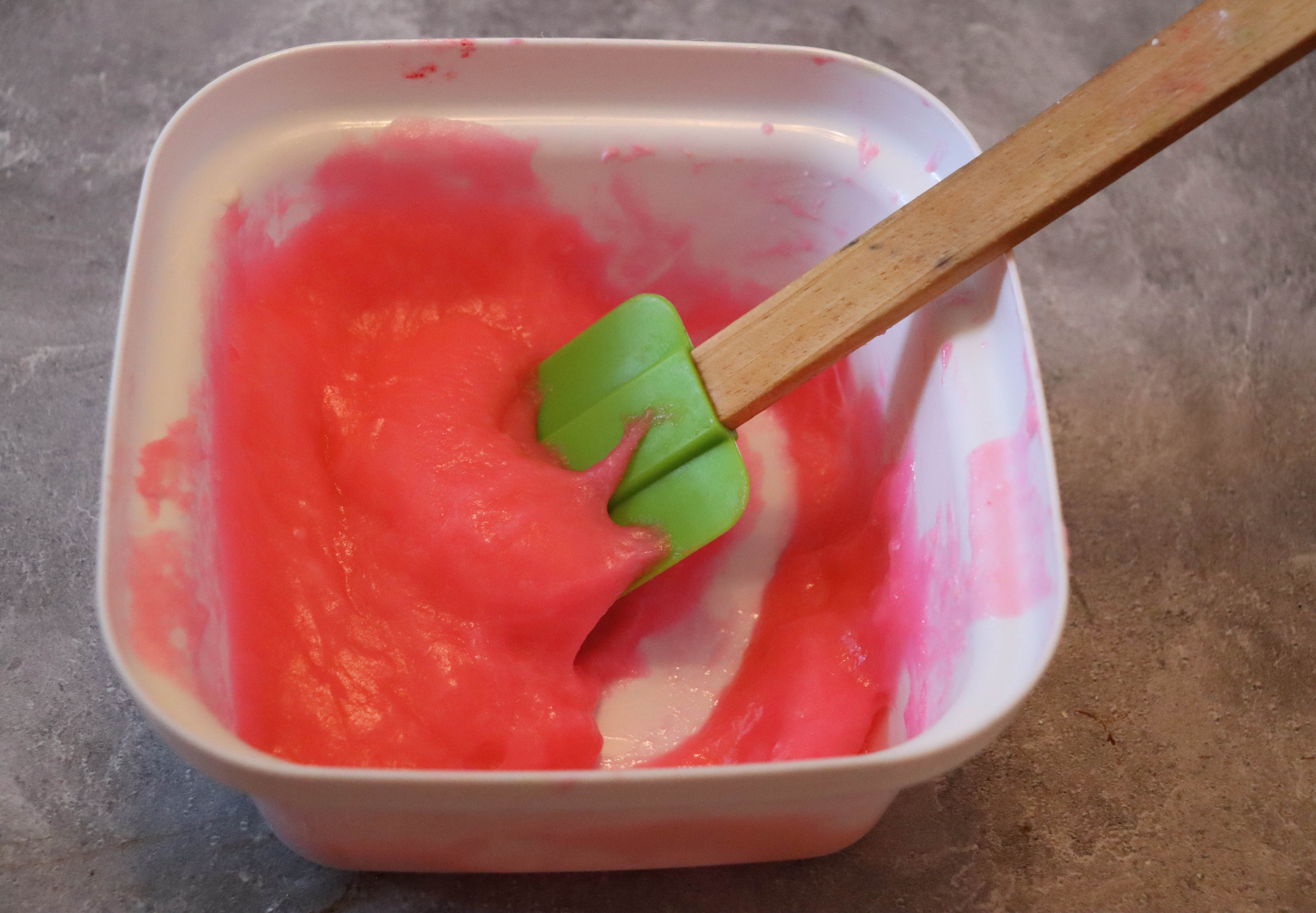 Next, make the mochi dough. In a microwavable bowl, combine one cup Glutinous Rice Flour, one cup water, and 1/4 cup white sugar. Stir with a rubber spatula, then microwave on high for one minute. Add a few drops of gel dye at this point, if using. Stir again with the spatula then microwave another one minute; repeat and heat a further 30 seconds (total microwave time is 2 1/2 minutes). The texture should be sticky and pliable. Let cool for a few minutes.