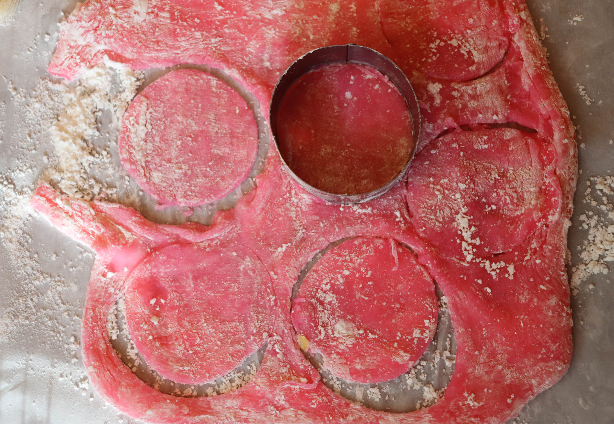 Transfer the parchment paper and dough to a tray and chill in the fridge for at least 30 minutes. Remove dough from fridge and cut out circles using a 3-inch (or 3.25-inch) round cutter. Place each circle on a small piece of parchment paper dusted with corn starch and chill them in the fridge or freezer for several minutes. After cutting out all the circles, you can re-use the dough scraps by re-heating the dough in the microwave for one minute, roll-out and then cut new circles.