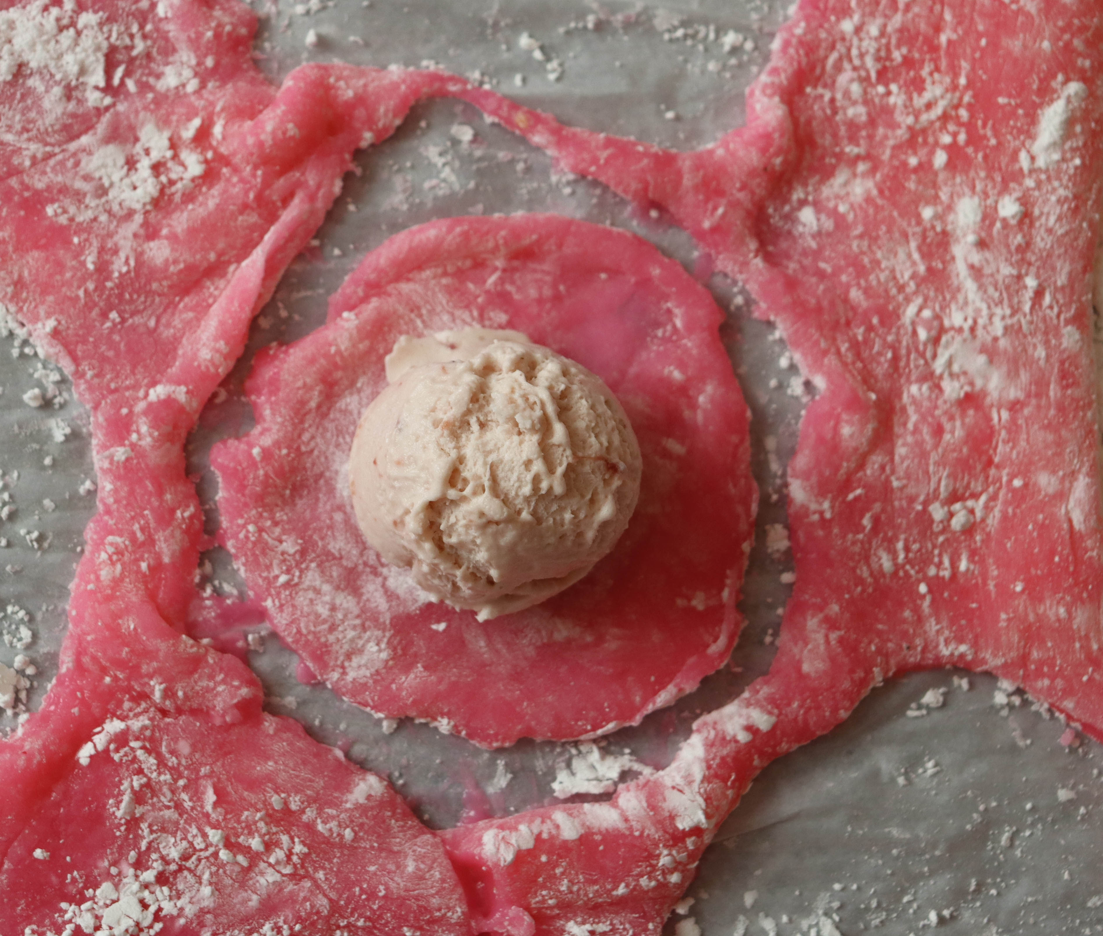 Working quickly, place a frozen ice cream ball on top of one of the chilled dough circles (leaving the remaining circles in the fridge until you need them). Bring the edges of the dough up to completely cover the ice cream, then pinch the edges of the dough together.