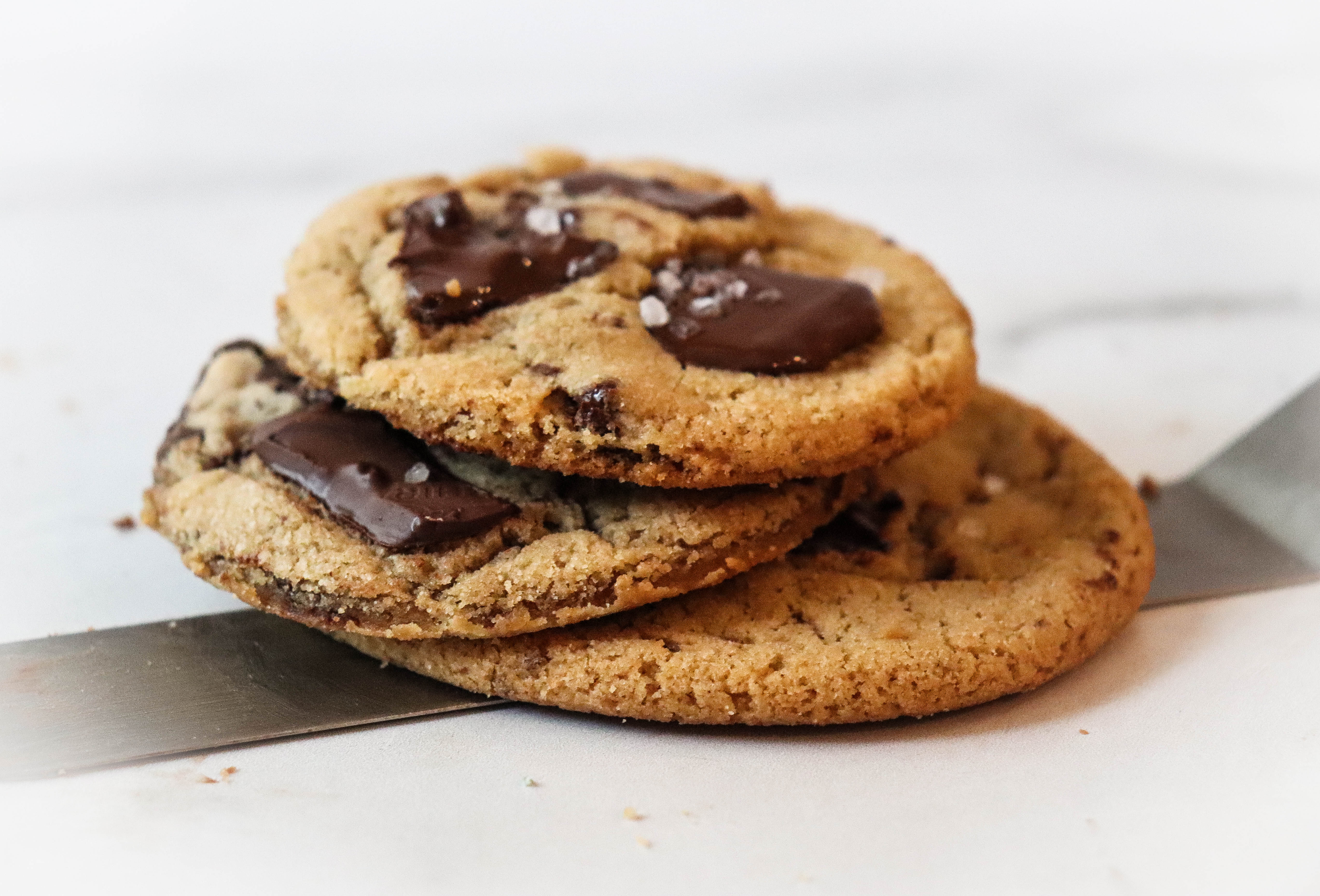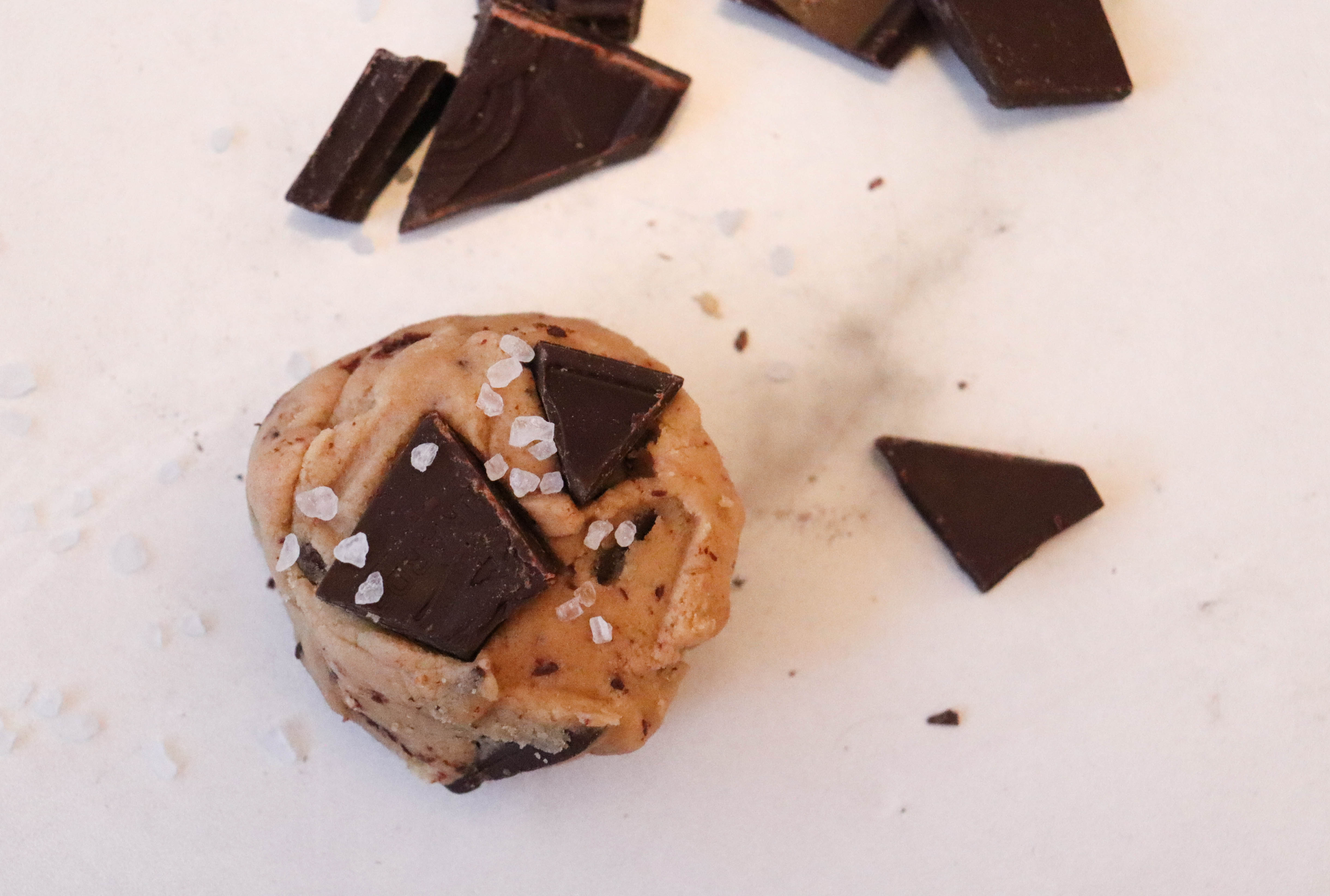 Before baking, flatten each chilled dough ball a little and add several more pieces of chocolate on top, along with several sprinkles of sea salt. Bake for 10-14 minutes until the cookies turn golden brown. (I like to bake mine for about 10 minutes, since they will harden a little as they cool). You’ll never go back to the old-style chocolate chip cookies again!